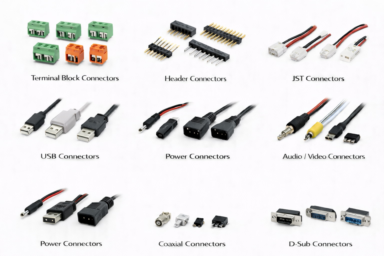Connectors are essential electronic components used to establish reliable electrical and mechanical connections between different circuits, cables, or devices. They allow signals, power, and data to be transferred efficiently while enabling easy assembly, maintenance, and replacement of electronic systems. Connectors are available in various types such as pin headers, sockets, terminal blocks, USB connectors, HDMI connectors, and board-to-board or wire-to-board connectors, designed to meet different electrical and mechanical requirements. They come with varying current ratings, voltage levels, pin configurations, and locking mechanisms to ensure secure and stable connections. Connectors are widely used in consumer electronics, industrial equipment, automotive systems, and communication devices, contributing to dependable performance, flexibility, and overall system reliability.