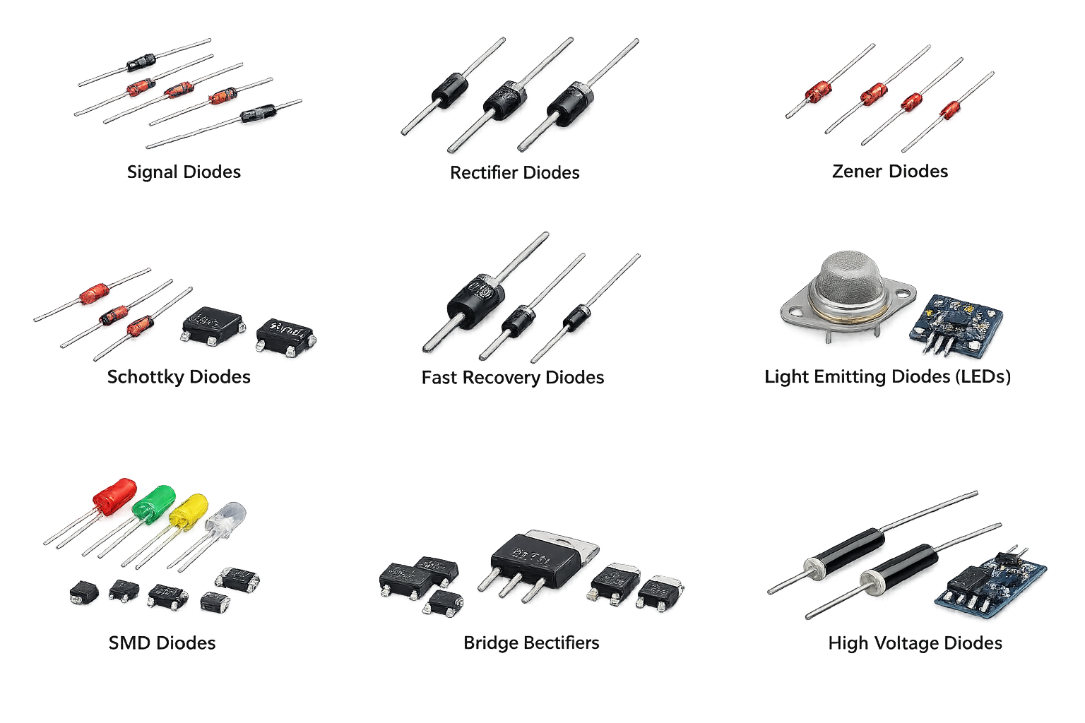 Diodes are essential electronic components used to control the direction of current flow in a circuit, allowing current to pass in one direction while blocking it in the opposite direction. They play a critical role in rectification, voltage regulation, signal demodulation, and circuit protection. Diodes are commonly used to convert AC to DC, protect circuits from reverse polarity, and suppress voltage spikes. Available in various types such as rectifier diodes, Zener diodes, Schottky diodes, light-emitting diodes (LEDs), and photodiodes, they come with different voltage ratings, current capacities, and switching speeds to suit diverse applications. Diodes are widely used in power supplies, consumer electronics, industrial systems, automotive electronics, and communication devices, contributing to circuit safety, efficiency, and reliable operation.