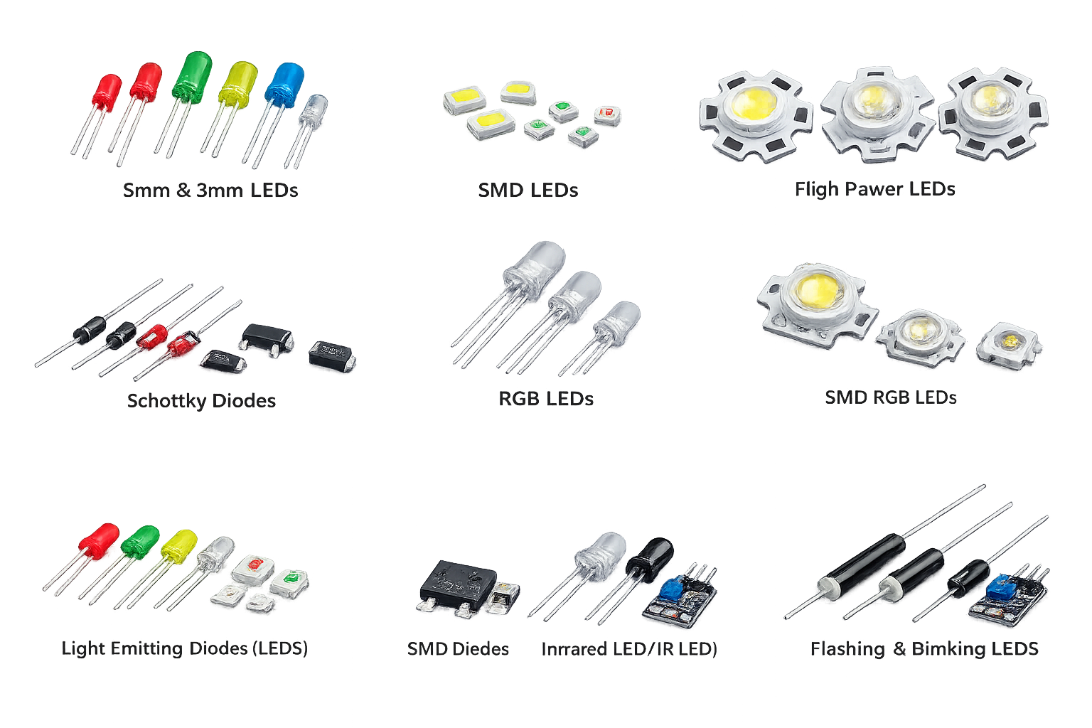 LEDs (Light-Emitting Diodes) are widely used electronic components that emit light when an electric current passes through them. They are known for their high efficiency, low power consumption, long lifespan, and fast response time. LEDs are commonly used for indication, display, and illumination purposes in electronic circuits. Available in various colors, brightness levels, sizes, and package types such as through-hole and surface-mount LEDs, they are designed to operate at different forward voltages and current ratings. LEDs are extensively used in consumer electronics, automotive lighting, display panels, signage, industrial equipment, and communication devices, contributing to energy efficiency, reliability, and enhanced visual performance.