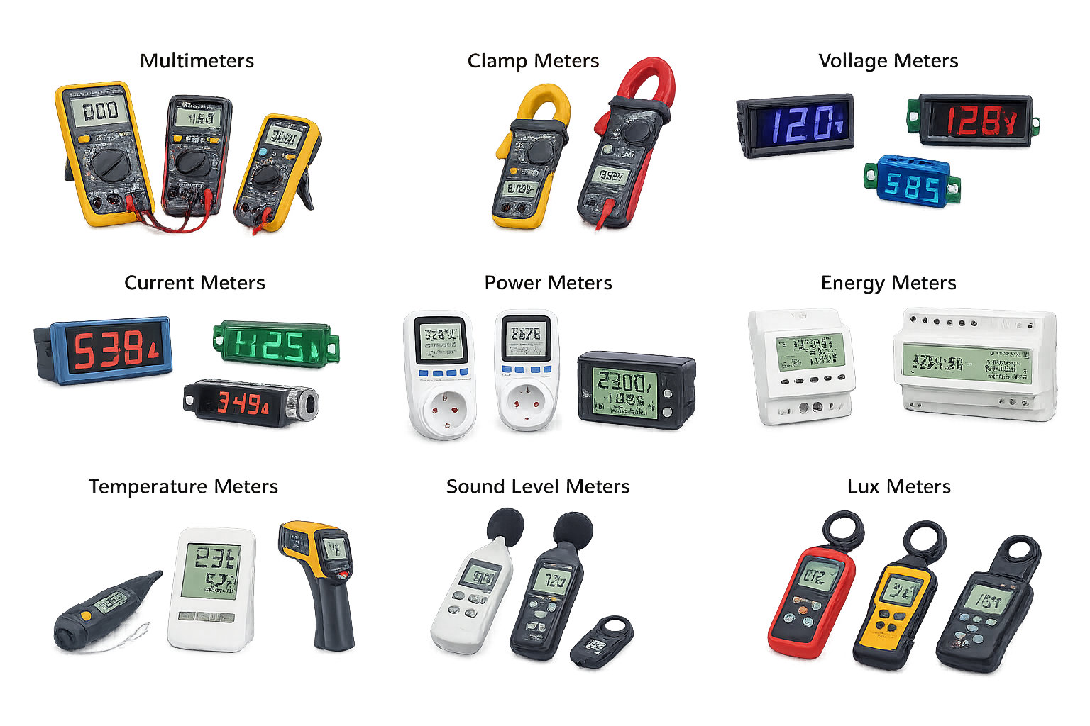 Meters are essential electronic measuring instruments used to monitor, measure, and display electrical parameters in circuits and systems. They are commonly used to measure voltage, current, resistance, power, frequency, and other related quantities, helping in testing, troubleshooting, and system monitoring. Meters can be analog or digital and are designed to provide accurate and reliable readings under various operating conditions. Available in different types such as voltmeters, ammeters, ohmmeters, multimeters, and power meters, they come with varying measurement ranges, accuracy levels, and display options. Meters are widely used in consumer electronics servicing, industrial maintenance, automotive diagnostics, laboratories, and educational environments, contributing to safe operation, precise measurement, and improved system performance.
