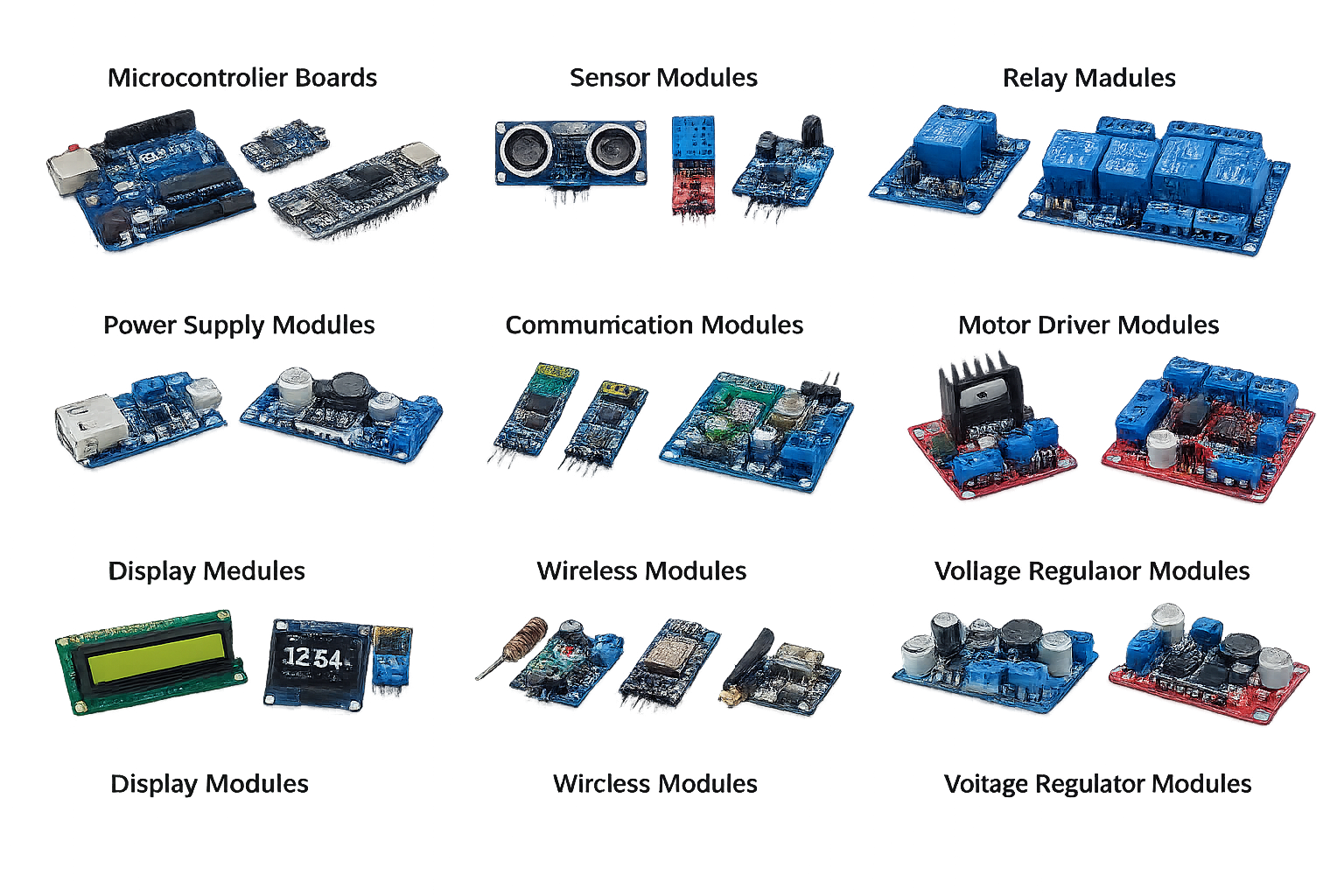 Electronic modules are integrated units that combine multiple electronic components into a single functional block designed to perform a specific task. They simplify circuit design and reduce development time by providing ready-to-use solutions for functions such as power regulation, communication, sensing, control, and signal processing. Modules are commonly used to interface with microcontrollers and embedded systems, enabling rapid prototyping and reliable system integration. Available in various forms such as power modules, sensor modules, communication modules, and driver modules, they come with defined input/output interfaces, operating voltage ranges, and performance specifications. Electronic modules are widely used in consumer electronics, industrial automation, IoT systems, robotics, automotive applications, and communication devices, contributing to faster development, improved reliability, and efficient system performance.