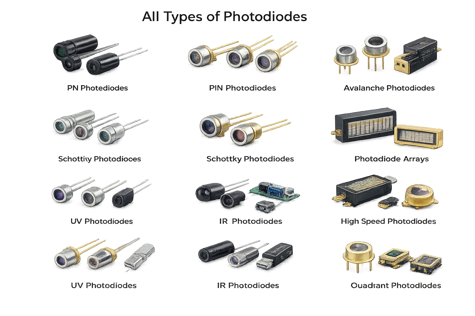 Photodiodes are light-sensitive semiconductor devices used to detect and convert light into electrical signals. They operate by generating a current or voltage when exposed to light, making them essential for optical sensing and light measurement applications. Photodiodes are commonly used in light detection, optical communication systems, and safety or control circuits. Available in different types such as PIN photodiodes, avalanche photodiodes, and phototransistors, they come with varying sensitivity levels, response speeds, and spectral ranges to suit specific requirements. Photodiodes are widely used in consumer electronics, industrial automation, medical equipment, optical instruments, and communication devices, contributing to accurate detection, fast response, and reliable performance.